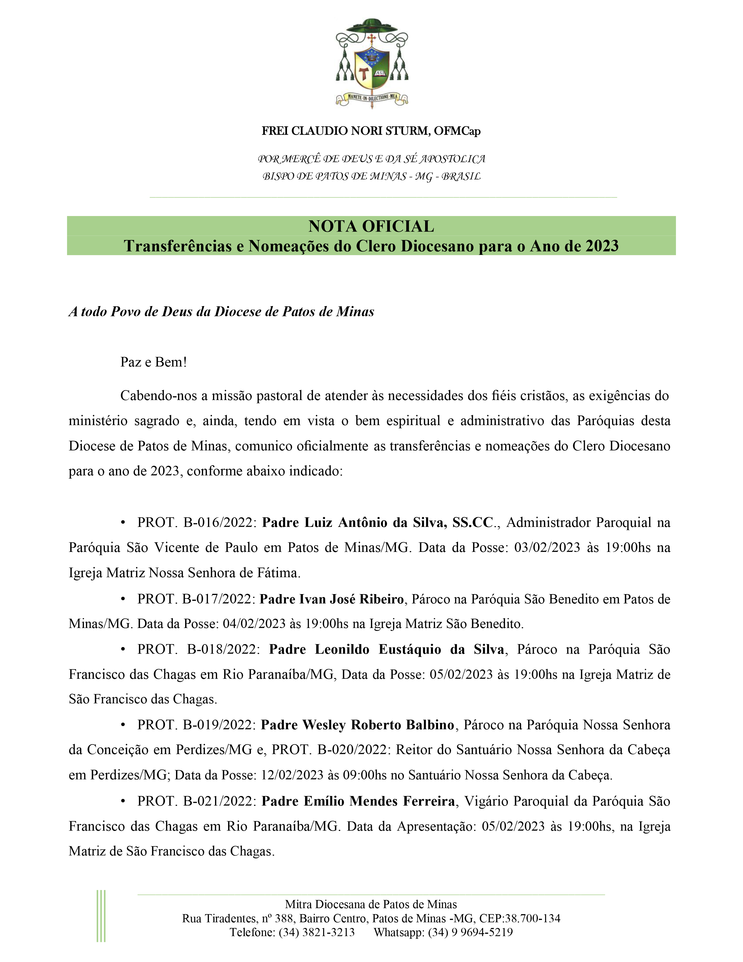 Cabendo-nos a missão pastoral de atender às necessidades dos fiéis cristãos, as exigências do ministério sagrado e, ainda, tendo em vista o bem espiritual e administrativo das Paróquias desta Diocese de Patos de Minas, comunico oficialmente as transferências e nomeações do Clero Diocesano para o ano de 2023, conforme abaixo indicado: